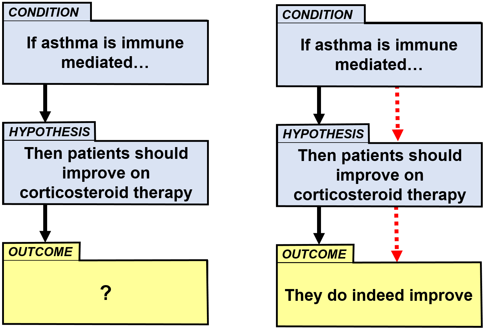 And so they devise and carry out an experiment, in the form of a clinical trial. They observe 200 asthmatics to establish a baseline for their pattern of asthma. Then they randomly assign 100 to a treatment arm, to receive prednisone, and 100 to a control arm, who receive a placebo. If the study outcome is as their hypothesis predicts (i.e. that treated patients will improve, while those receiving placebo do not), then this provides experimental support for their hypothesis.