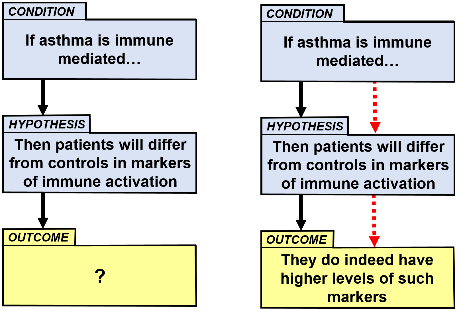 - (The outcome, here advanced as a prediction) Then we would expect that asthmatic patients differ significantly from healthy, matched controls in terms of levels of IgE, frequency of allergy, etc..